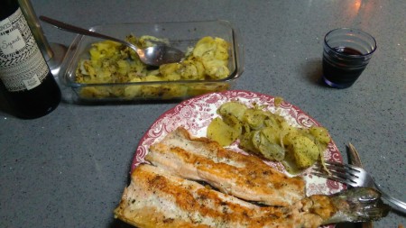 Pimientos del Piquillo rellenos con bechamel de salmón ahumado y gambas sobre lecho de salsa de piquillo